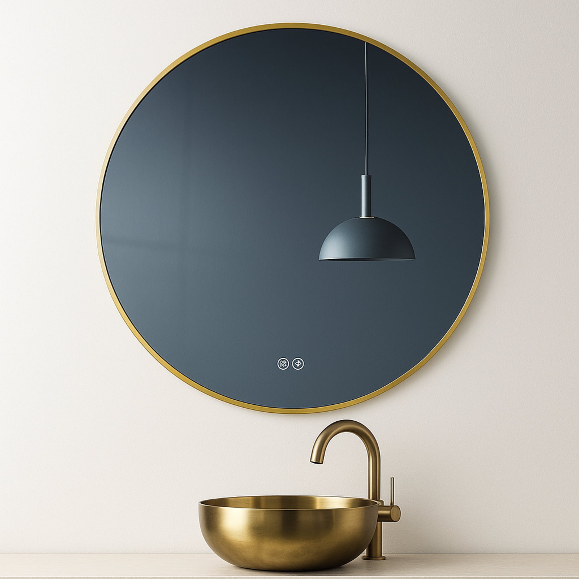 The Aureli LuxeCircle X8 Smart Mirror is designed for those who demand the best. This fully-equipped mirror features a round copper-free glass surface with a brushed brass bezel, dimmable 360° LED backlighting, anti-fog heating, and touch icons for instant control with on-glass time/temperature. With enough brightness customization for grooming or ambiance, this mirror also features a stylish and highly functional layout, perfect for the ultimate bathroom vanity experience.